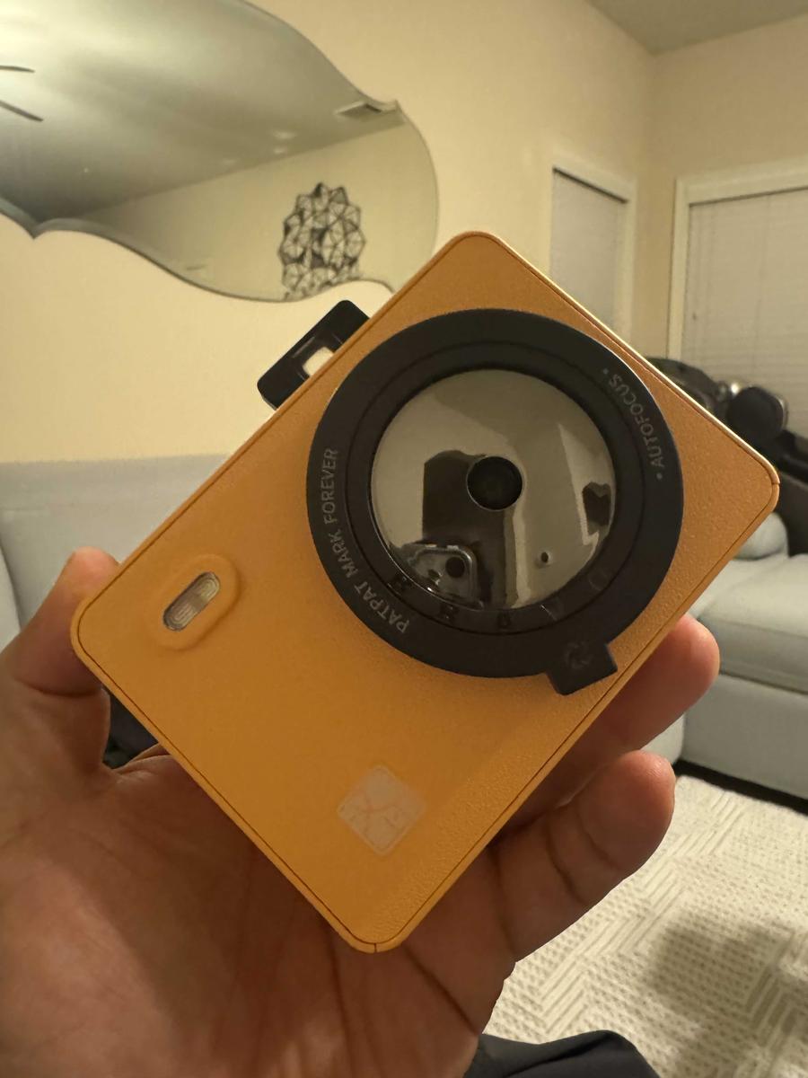 This is a yellow, instant print camera featuring a Retro Pop-up Viewfinder activated by pressing a button. It includes Autofocus and quickly prints photos, perfect for capturing and sharing memories instantly.